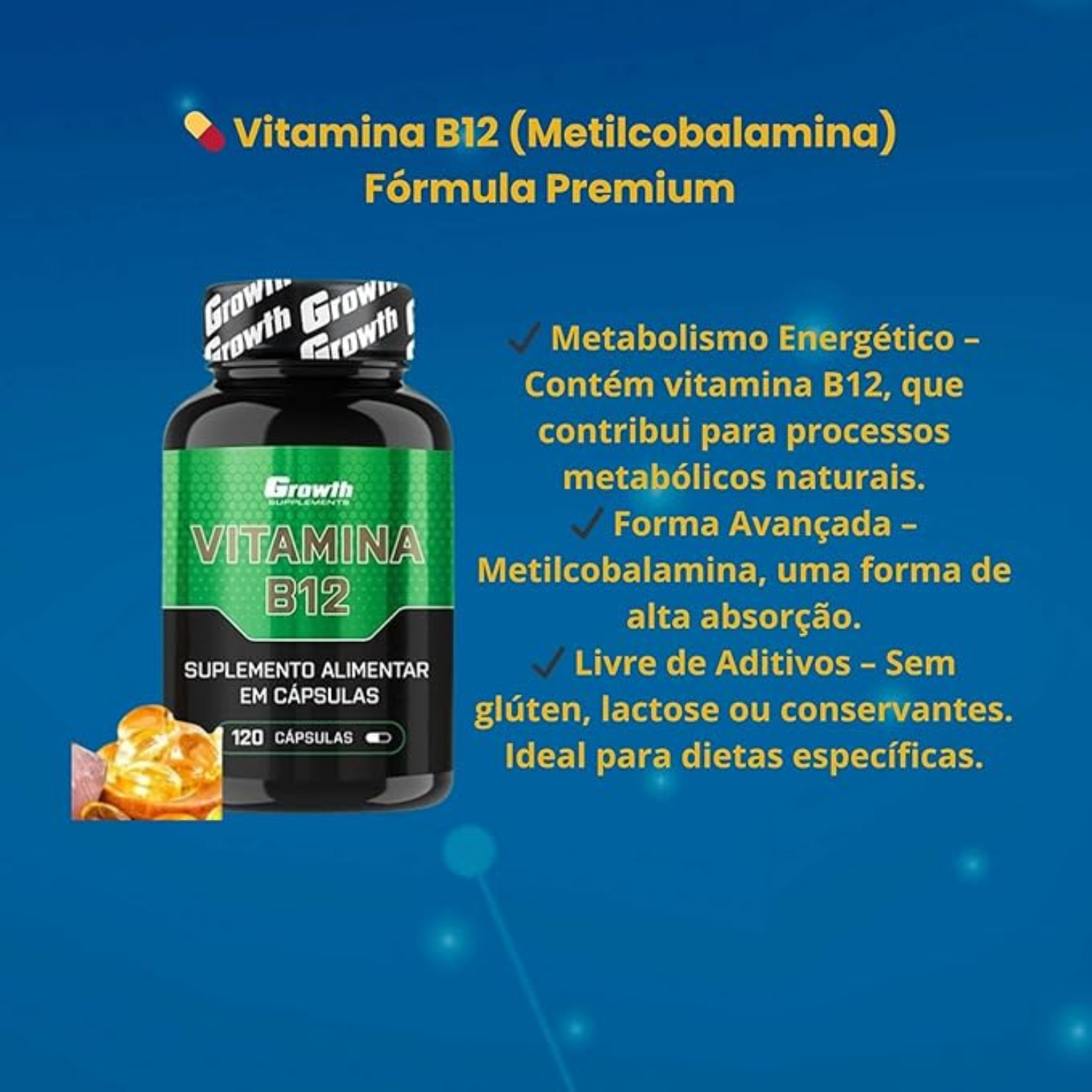 A vitamina B12 é fundamental para o metabolismo energético, saúde neurológica e formação de células sanguíneas. Nessa fórmula da Growth, é utilizada a forma ativa metilcobalamina, que apresenta maior biodisponibilidade, garantindo absorção e eficácia superiores. Livre de glúten, lactose e conservantes, é uma opção segura para diferentes tipos de dieta.