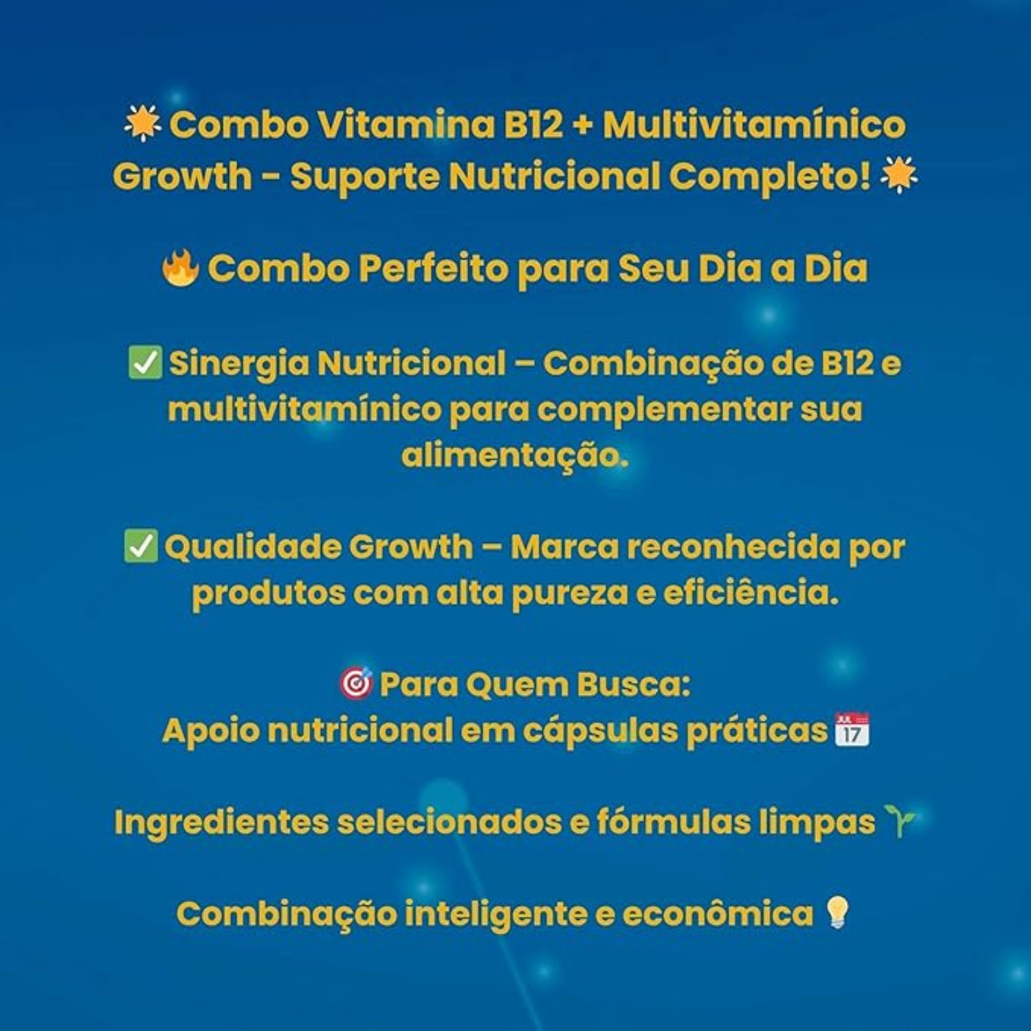 Este combo da Growth Supplements reúne dois suplementos essenciais para quem busca mais energia, saúde e equilíbrio no dia a dia. A combinação da vitamina B12 na forma ativa (metilcobalamina) com um multivitamínico completo oferece suporte nutricional de alta qualidade, ideal para complementar uma rotina saudável.