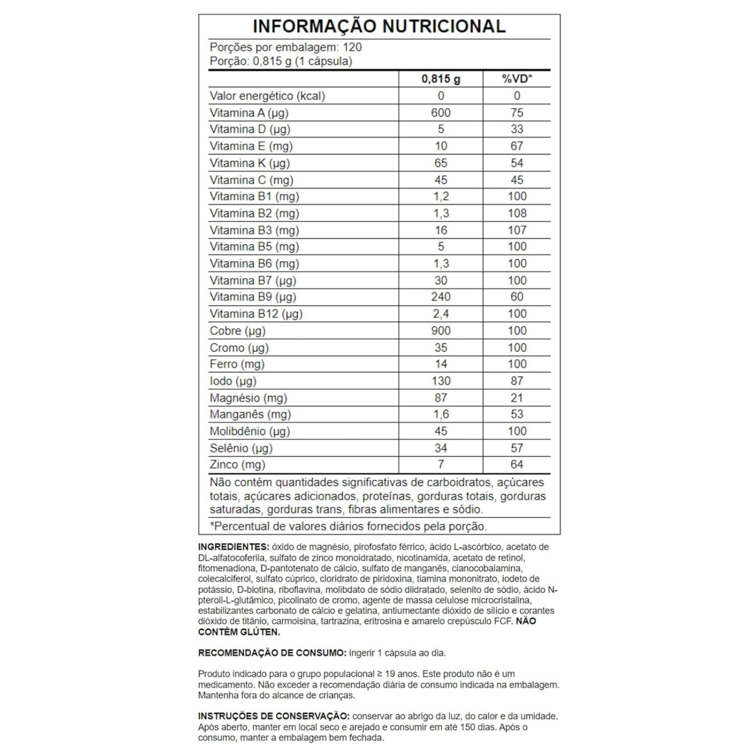 O multivitamínico contém um mix equilibrado de vitaminas e minerais como A, C, D, E, zinco e selênio, que ajudam a manter a imunidade, combater o cansaço e apoiar diversas funções do organismo. Com dose única diária, é uma solução prática para reforçar sua alimentação com segurança e sem adição de açúcares ou corantes artificiais.